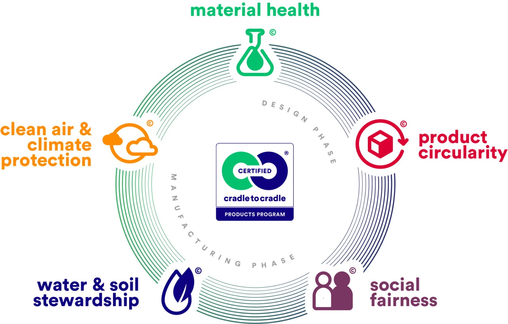 Cradle to Cradle® Certified is a globally recognised standard for environmentally and socially sustainable products. Developed by the Cradle to Cradle Products Innovation Institute, it helps companies across a wide range of industries to design and manufacture products that are safe, circular, and sustainable. Certification independently verifies a product’s performance across five key areas: