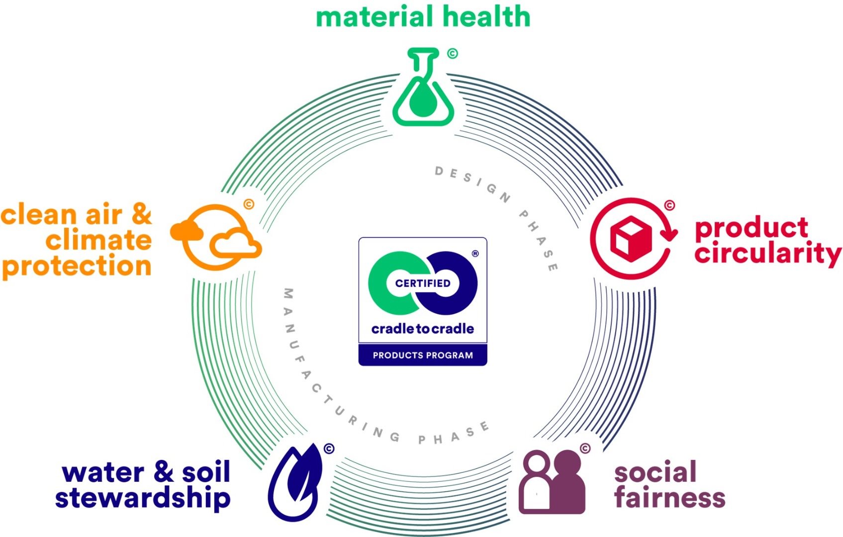 Cradle to Cradle® Certified is a globally recognised standard for environmentally and socially sustainable products. Developed by the Cradle to Cradle Products Innovation Institute, it helps companies across a wide range of industries to design and manufacture products that are safe, circular, and sustainable. Certification independently verifies a product’s performance across five key areas:
